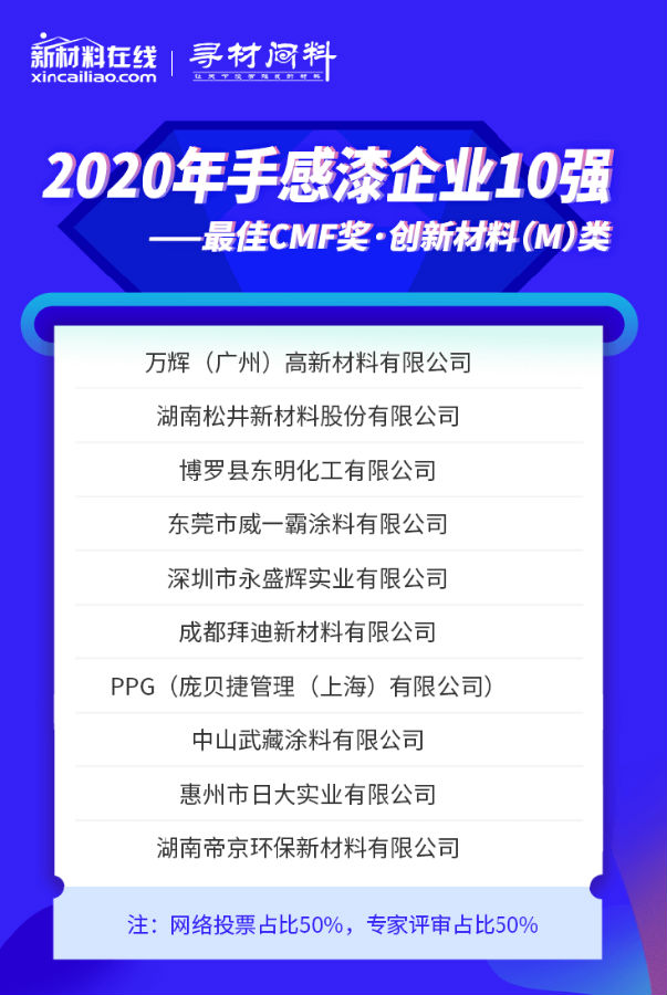 近期,知名傳媒尋材問料?”表示收到很多終端品牌關于手感漆方案的咨詢,基于此背景,尋材問料?特發起“2020年手感漆企業10評選活動,助力終端尋求優質的供應商資源。尋材問料組委會根據企業的主營產品和綜合實力,聯名推薦約20家知名涂料企業進入投票名單,將最終得出前十強名單。前十名排名先后順序將根據網絡投票占比50%專家評審占比50%票數總和由大到小所得。