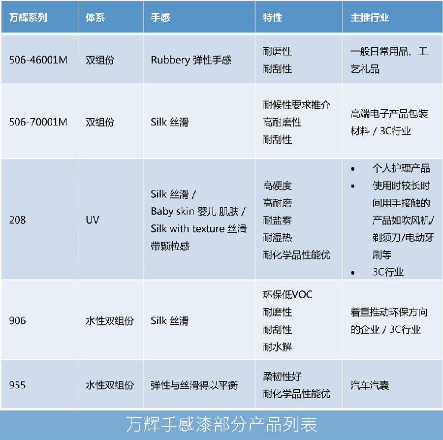 萬輝的手感漆,施工性穩定,并根據客戶不同需求研發出了多種量身訂制種類,如配合環保方面可以符合玩具產品需求、普通平價產品的需求、具有一定抗回粘性及耐磨性需求、綜合性能優異的需求等;同時在手感觸摸體驗上也做出了不同的體驗效果,如手感爽滑觸感、高彈性觸感、嬰兒般皮膚爽滑觸感等;在視覺上,手感漆本為透明無色,萬輝產品手感漆可配合客戶需求噴涂一個有色底漆以提高視覺效果;在技術上,萬輝技術研發人員仍在不斷研發測試及創新,目前已有2kPUWB2kPUUV等產品體系,適應客戶不同的環境施工需求。