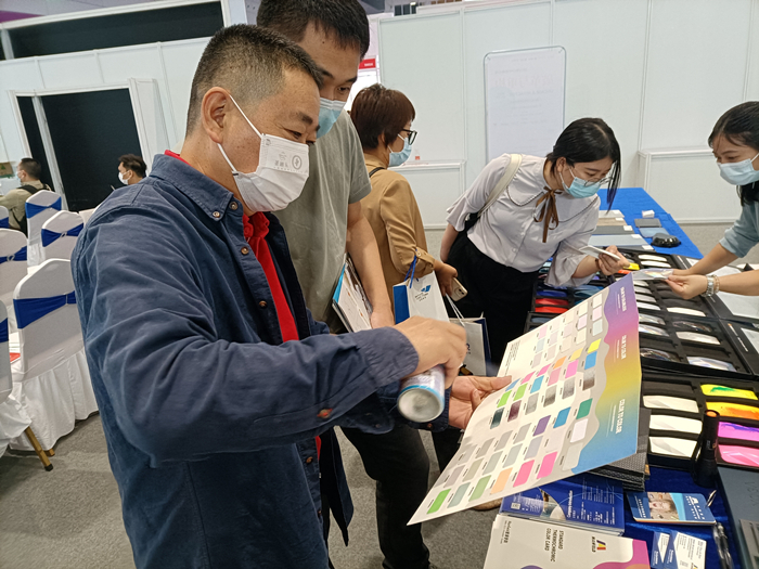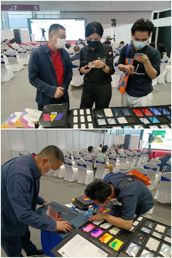 CMF設計師在萬輝展臺駐足良久,對萬輝各系列產品表示十分感興趣,并期待后期能收到我們的樣板來進行他們的設計規劃。