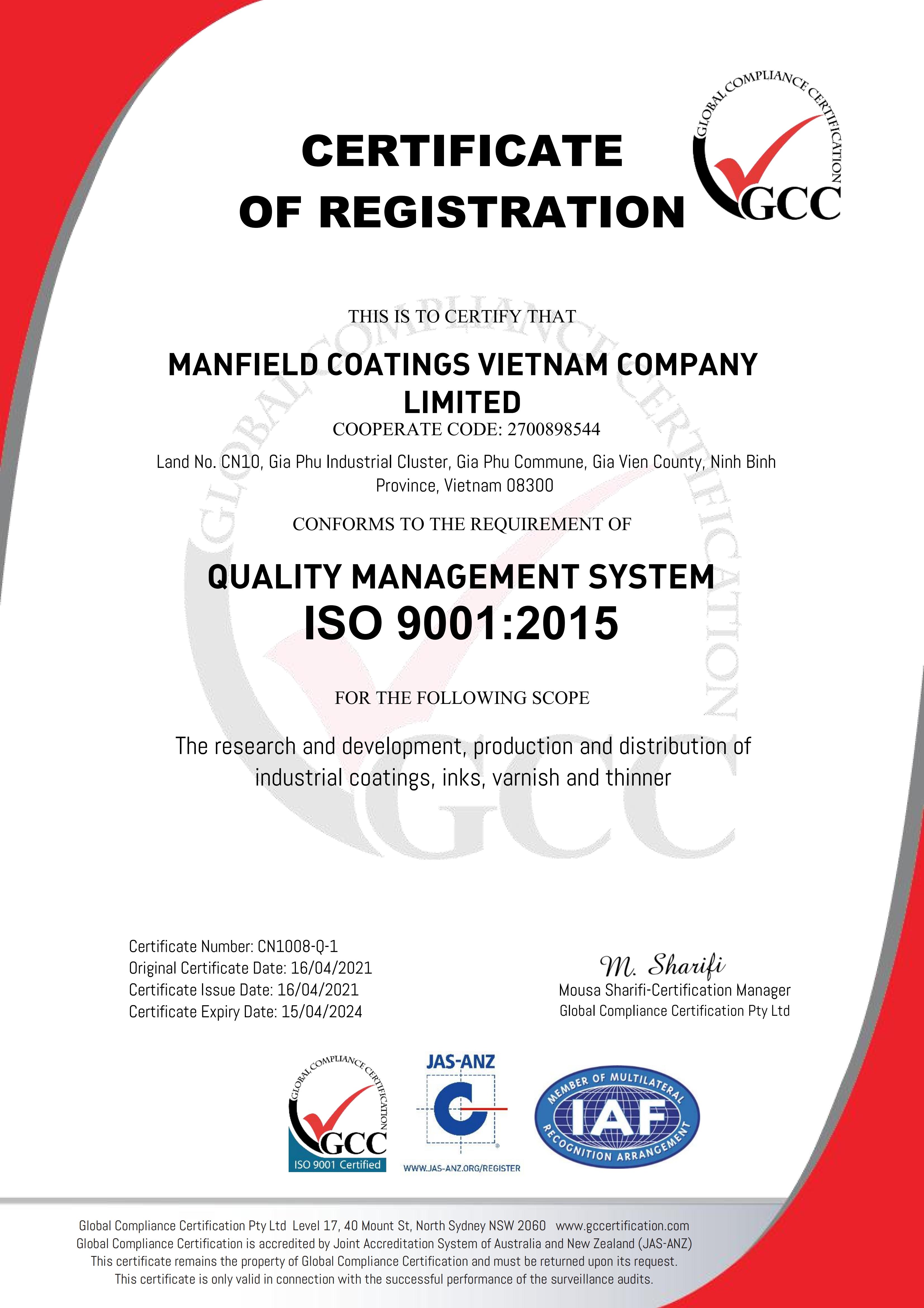 TUV ISO 9001: 2015 (Manfield Coatings Viet Nam)